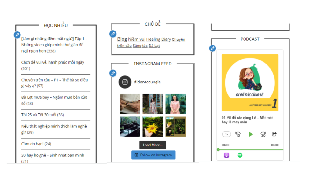 Vậy theme của mình đã có sẵn gì: Đó là bình luận, bài viết mới nhất, bài được nhiều người đọc nhất. Mình chỉ việc customize dô là xong.