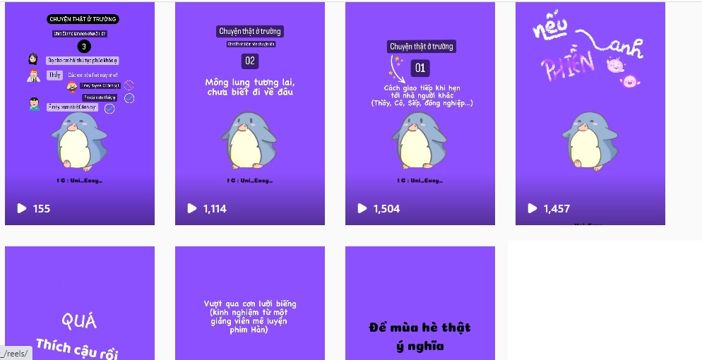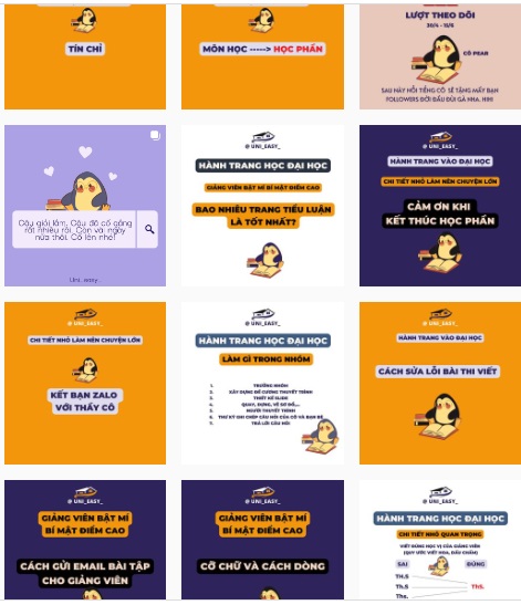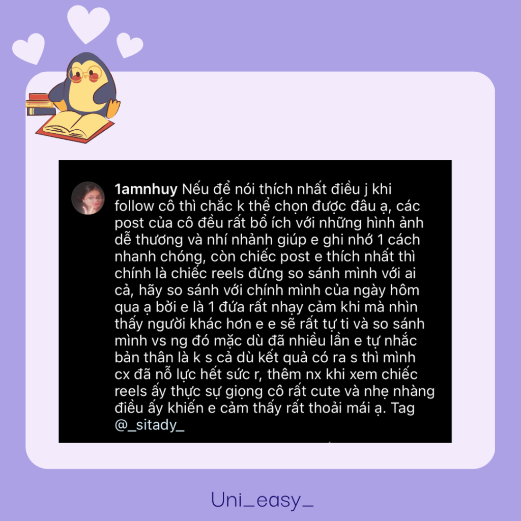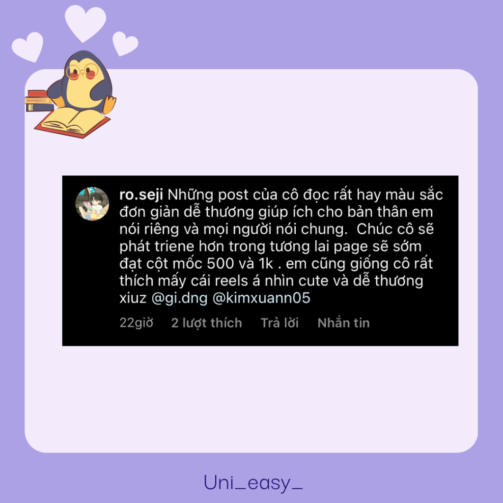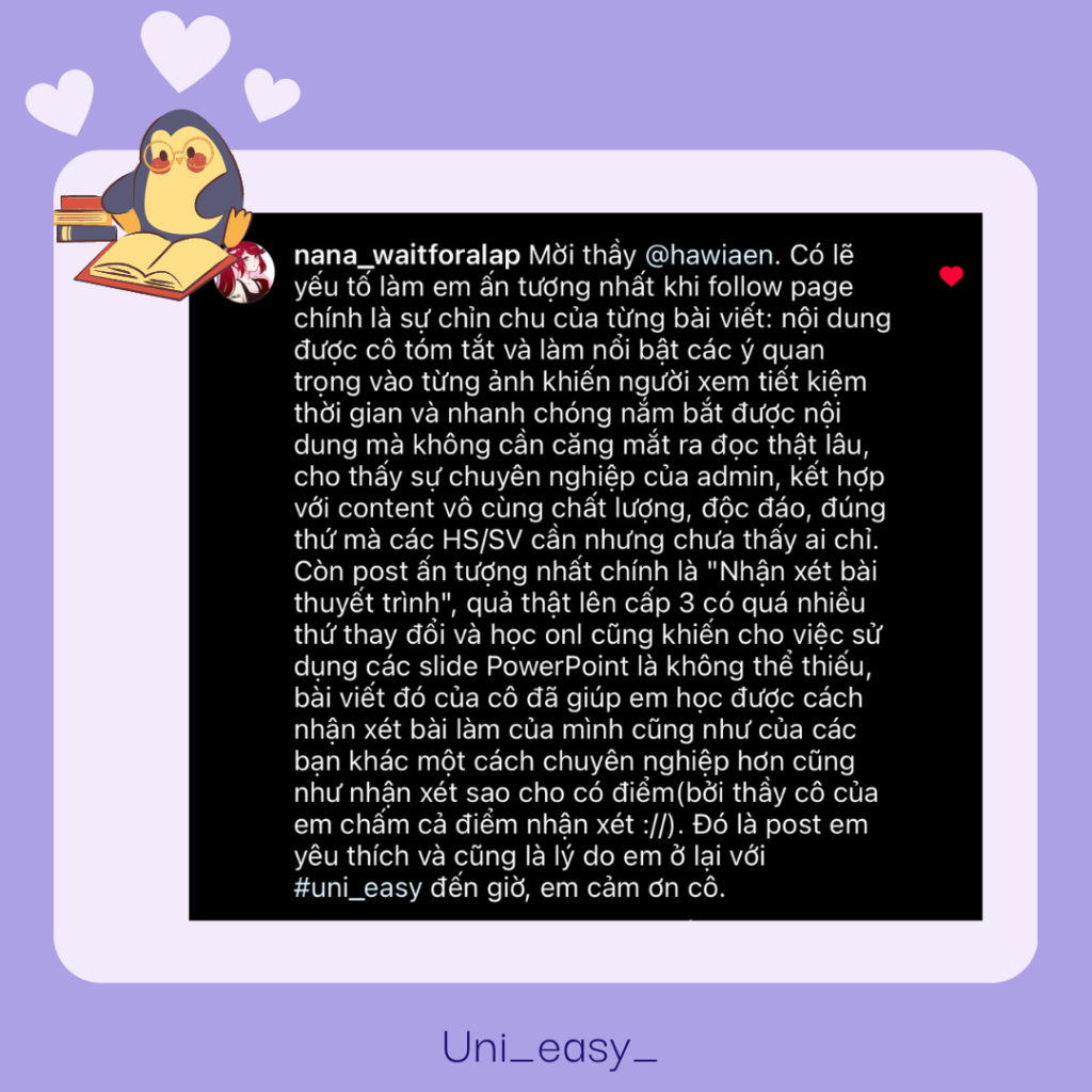 Ting ting…. tại là cô đây! Cô Pear với biểu tượng chim cánh cụt nhún nhảy, background màu tím mộng mer chào các em đến với Instagram Uni_Easy_