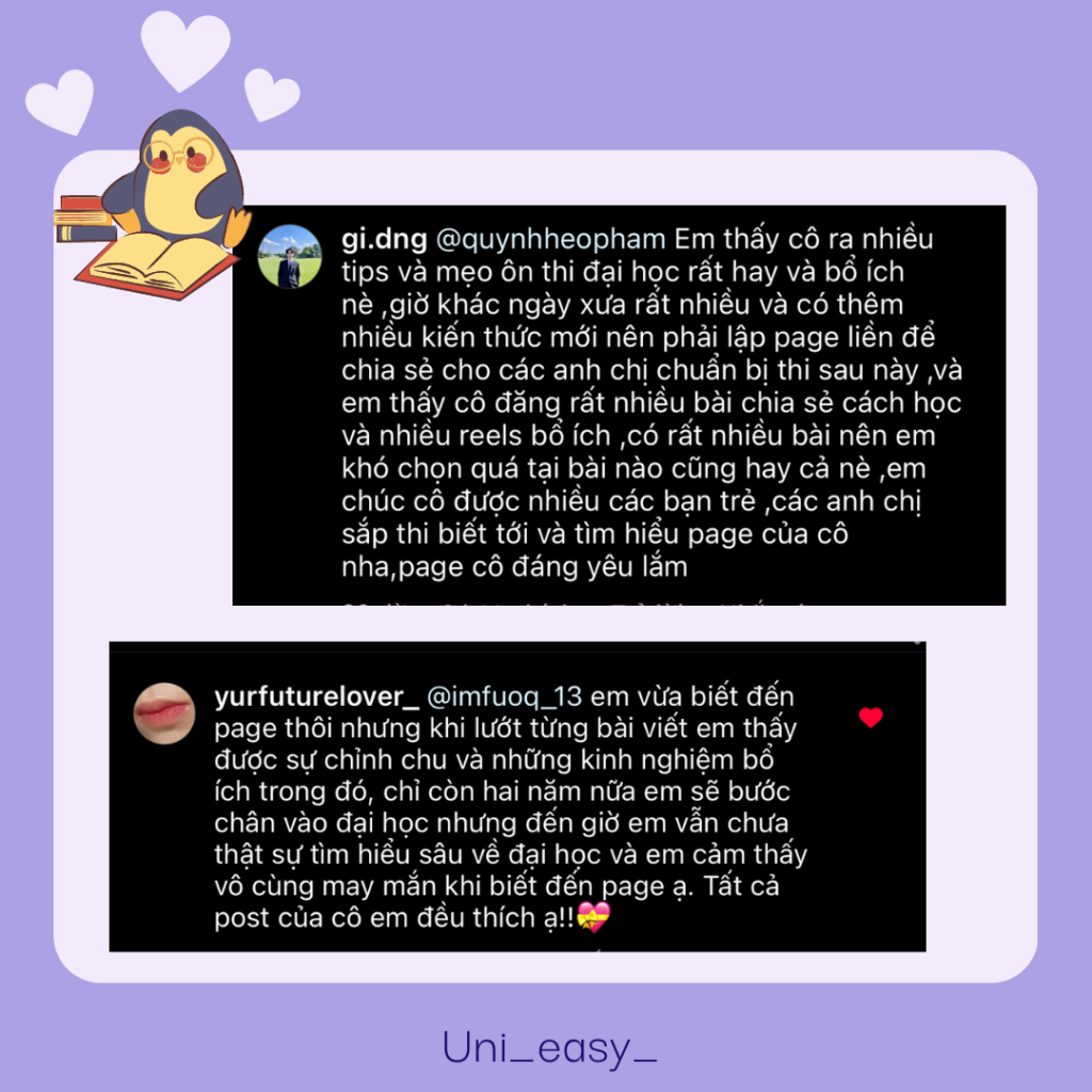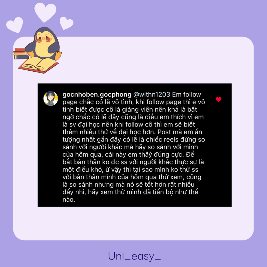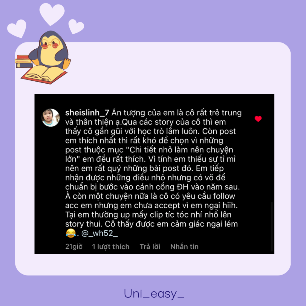 Sau hơn 8 năm giảng dạy, mình thấy các em sinh viên còn rất bỡ ngỡ trong việc gửi email, trình bày tiểu luận, slide, cách thuyết trình, giao tiếp với giảng viên, làm quen bạn bè, họp nhóm… Đó là động lực giúp mình “đẻ” ra Uni Easy. Mỗi ngày mình đều cố gắng làm gì đó để thời gian trôi qua của các em không hoài phí. Mỗi ngày lên Instagram muốn các em học được thêm điều gì đó tích cực.