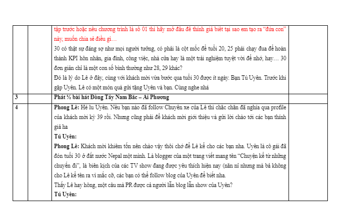 - Ca khúc/Bài hát: Phát giữa các phần trò chuyện. Phần này có thể có hoặc không. Nếu có thì bạn có thể phát 1/2 bài, 1/4 bài, điệp khúc hoặc toàn bài.